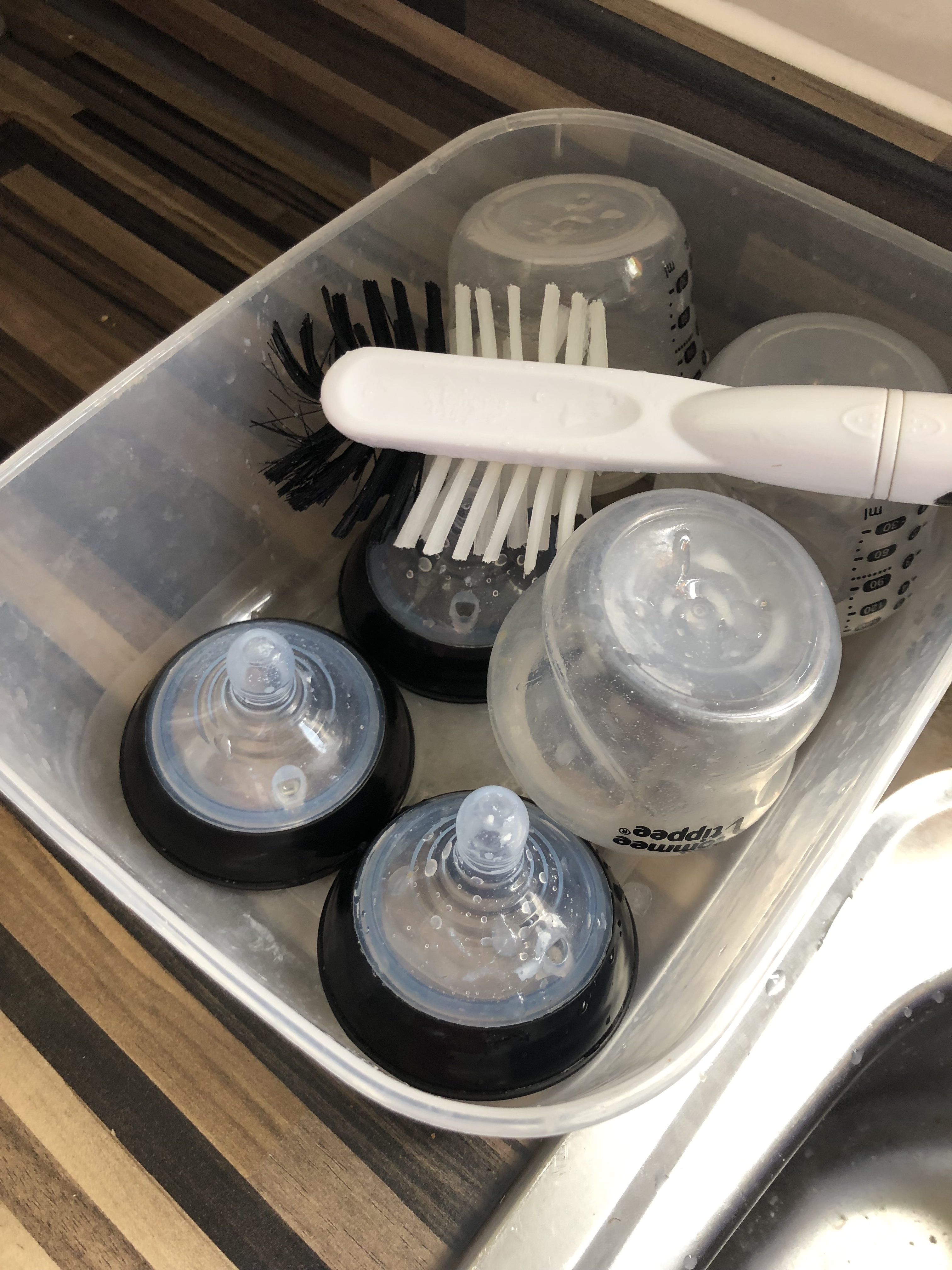 Finally further along the production line … to keep the bottles seperate from all the other washing up I’ve got a plastic tub next to my sink which I put the washed out bottles in that need to be sterlised. The brush came with the bottle set.