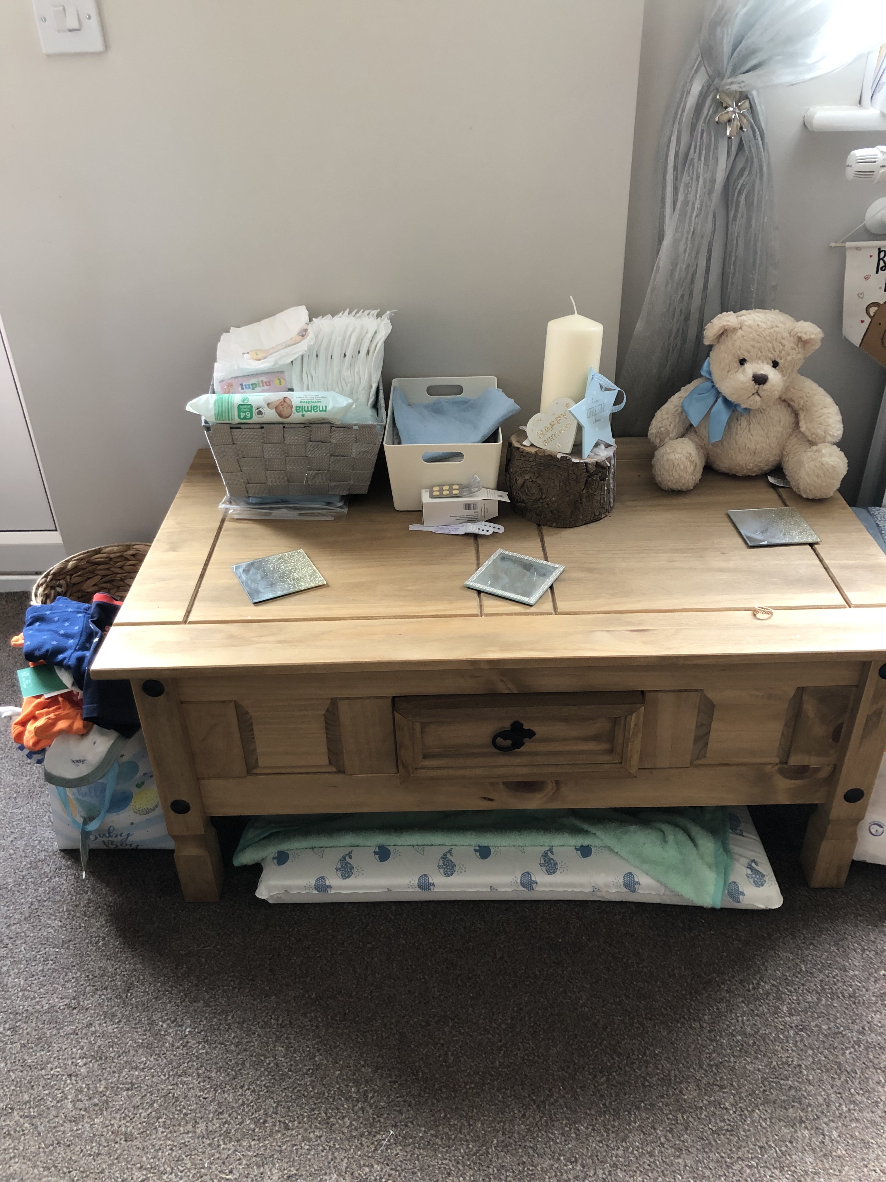 Following on from the nappy changes this really is my TOP TIP of the whole blog post because without this one simple thing I would be screwed and forever running up the stairs to grab stuff I need. What you need to do is set up a little baby station downstairs where you keep everything you need so it’s on hand! My coffee table has become my baby station and on it we have all the changing essientails including a changing mat under the table ready to pull out when needed. Nappies, wipes, nappy bags, Muslin cloths and a bag of clean clothes (be prepared for several change of clothes in one day) our current record is 7! It may make my living room look like aisle 7 in mothercare but my god does it save me time! So get your baby stations ready ladies! And daddy’s! ( I also have one set up in my bedroom for the night feeds)